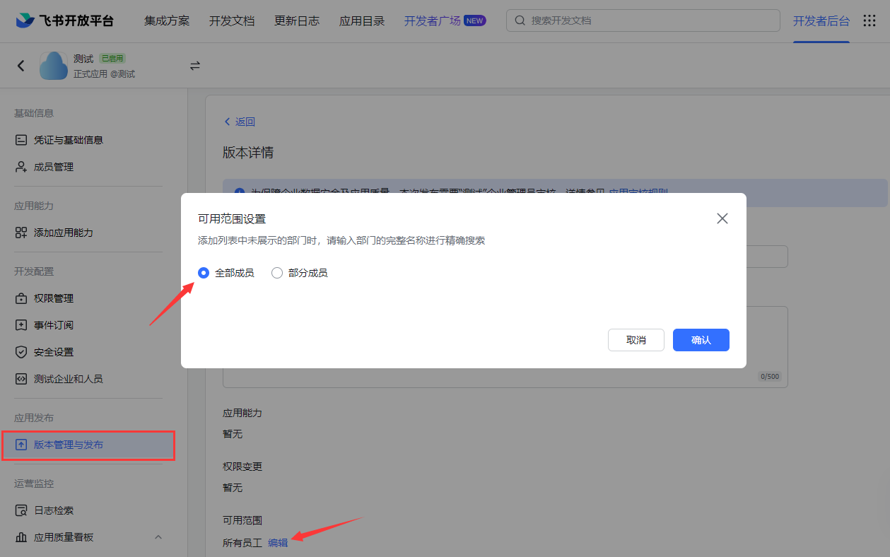 设置权限后需进行一次应用发布和后台安装飞书初始化,不然事件订阅>>请求地址配置时会验证不通过