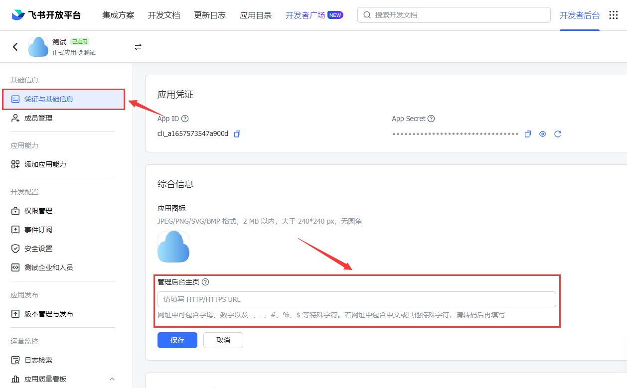 进入后台管理页面站点配置->第三方配置->飞书应用配置页面,将刚才所记录的内容,填写到对应的输入框内。