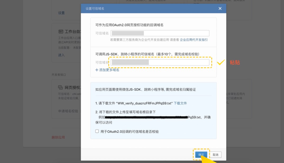 2、粘贴至 企业微信 的网页授权及JS-SDK,点击设置可信域名