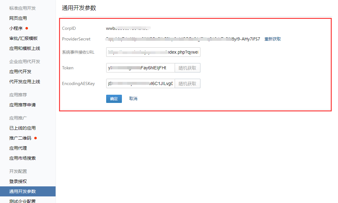 返回并点击通用开发参数,将第5步中的Token 和 EncodeingAESKey填写到相应的输入框内。