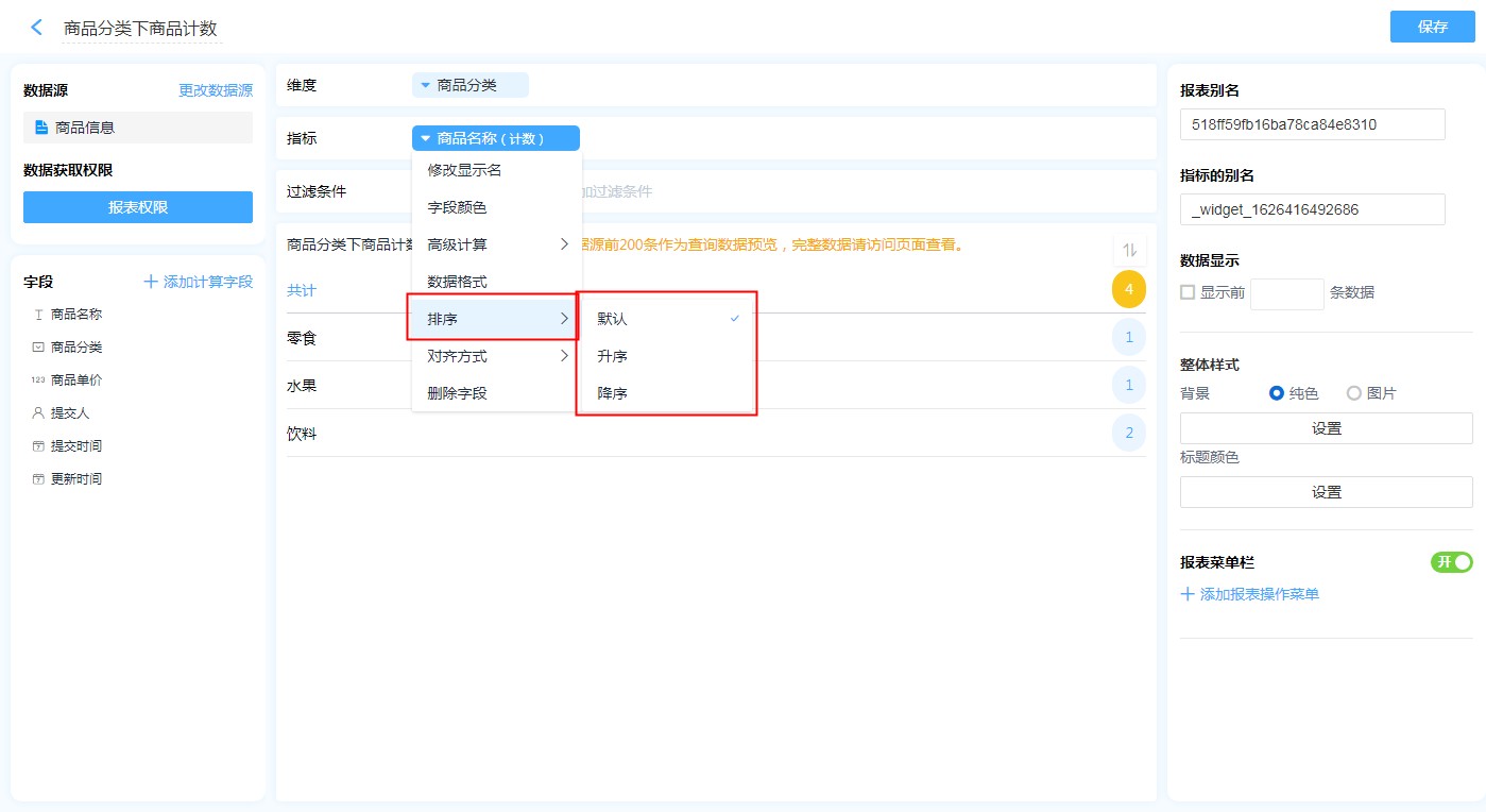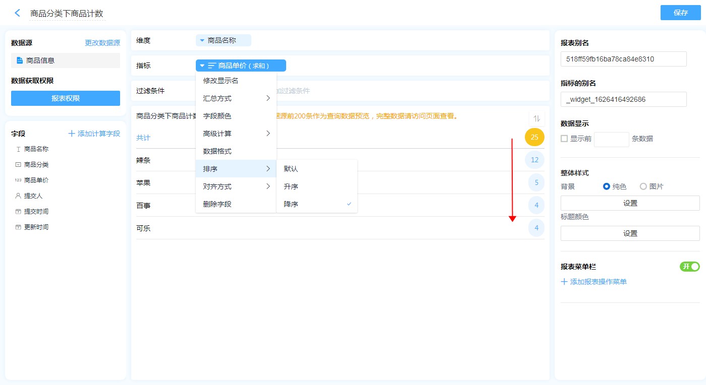 在报表使用过程中,为了方便数据的查看与管理,往往需要对报表中的图表数据进行排序。