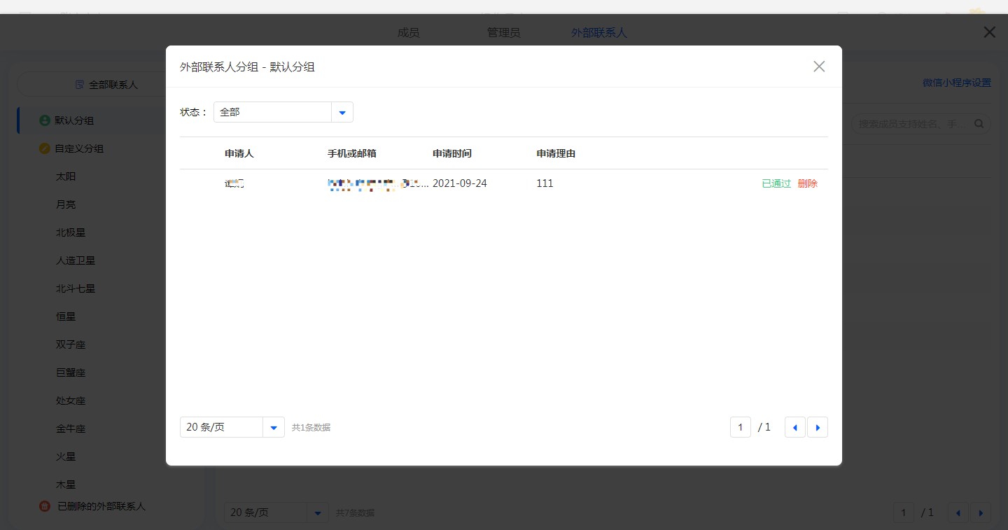 支持对当前分组内的外部联系人,按姓名、手机、邮箱进行模糊搜索。
