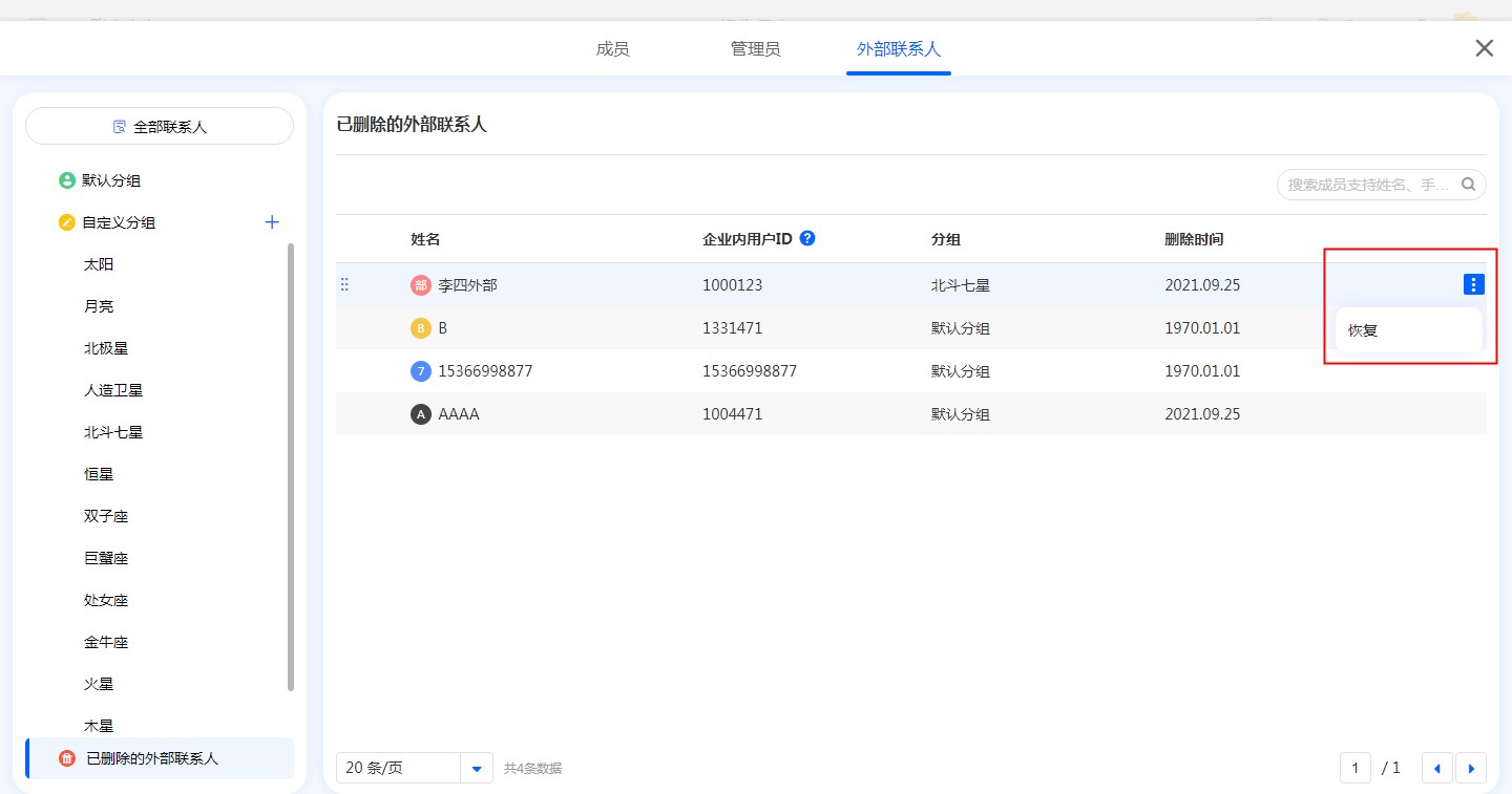 注意:已邀请状态的外部联系人删除后直接清除,不会进入【已删除的外部联系人】列表中。