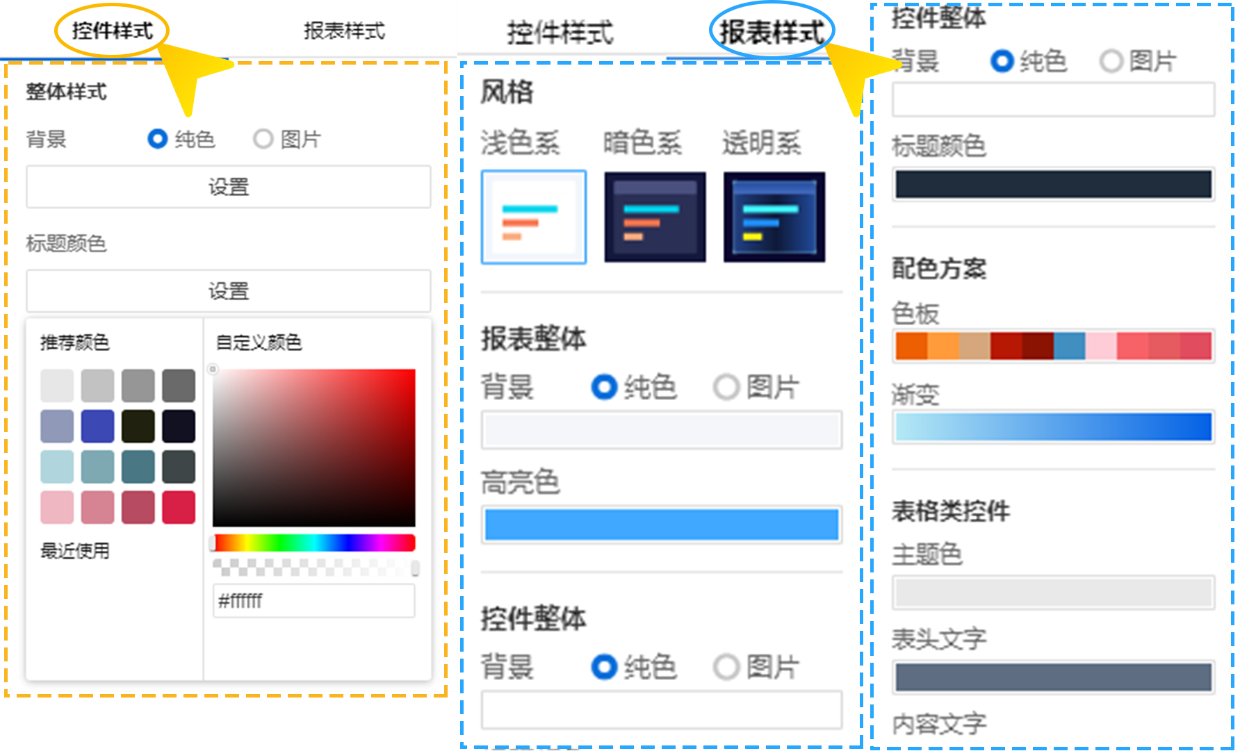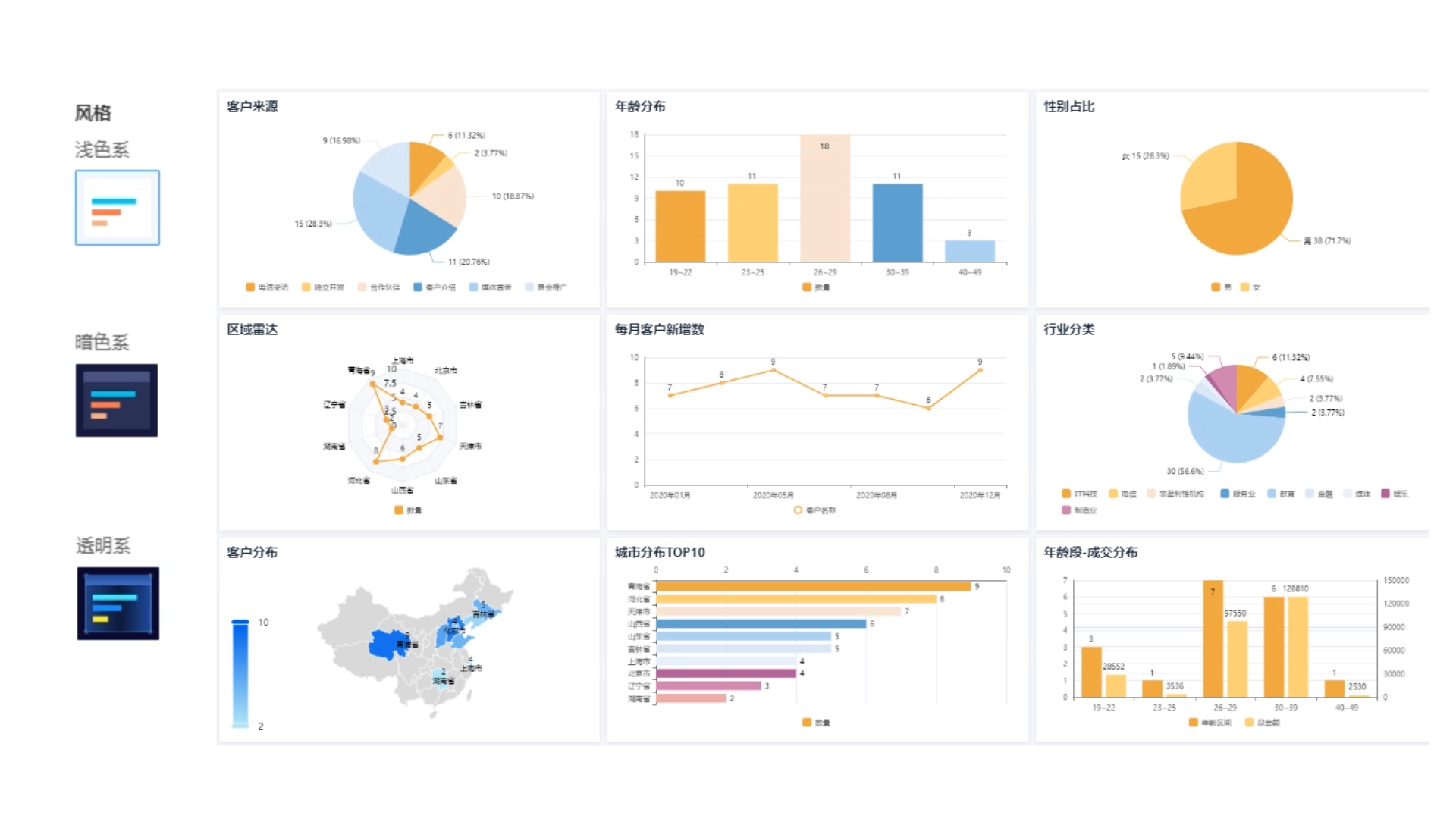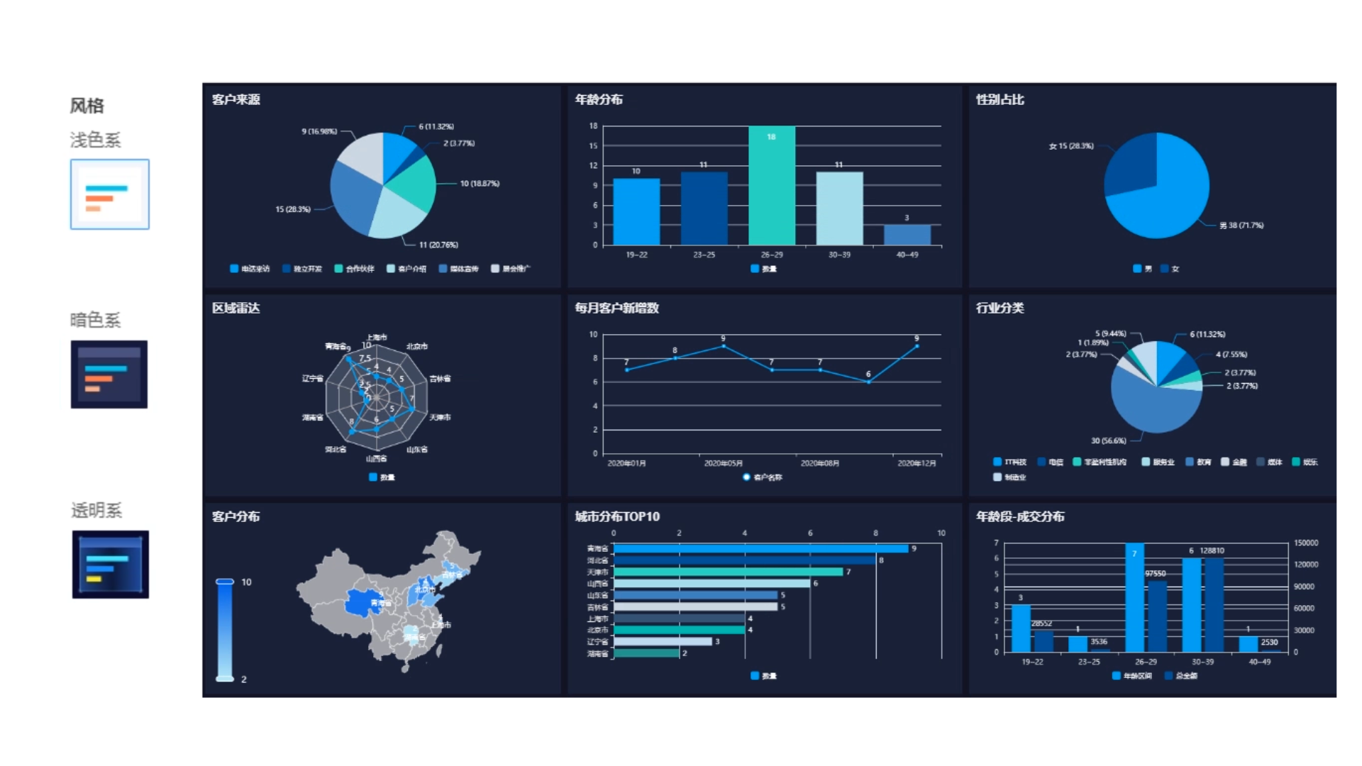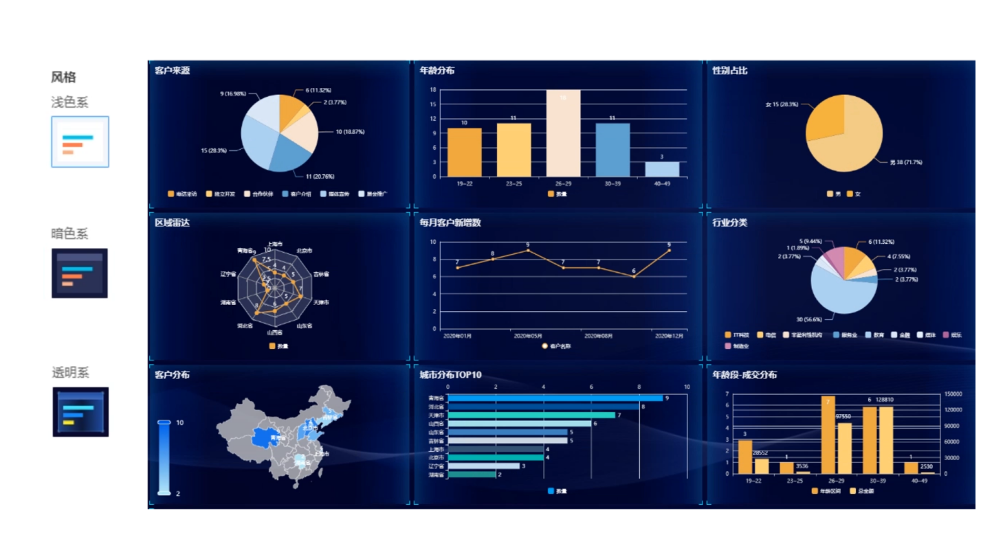 可对现有报表进行编辑,通过分析报表整体样式设置可以快速完成仪表盘视觉风格的转换。市面上酷炫的报表看板制作过程较为复杂,而数转平台不仅对于单个组件的特殊展示需求支持单独配置,也支持快捷设置报表整体风格,风格一键即可切换。