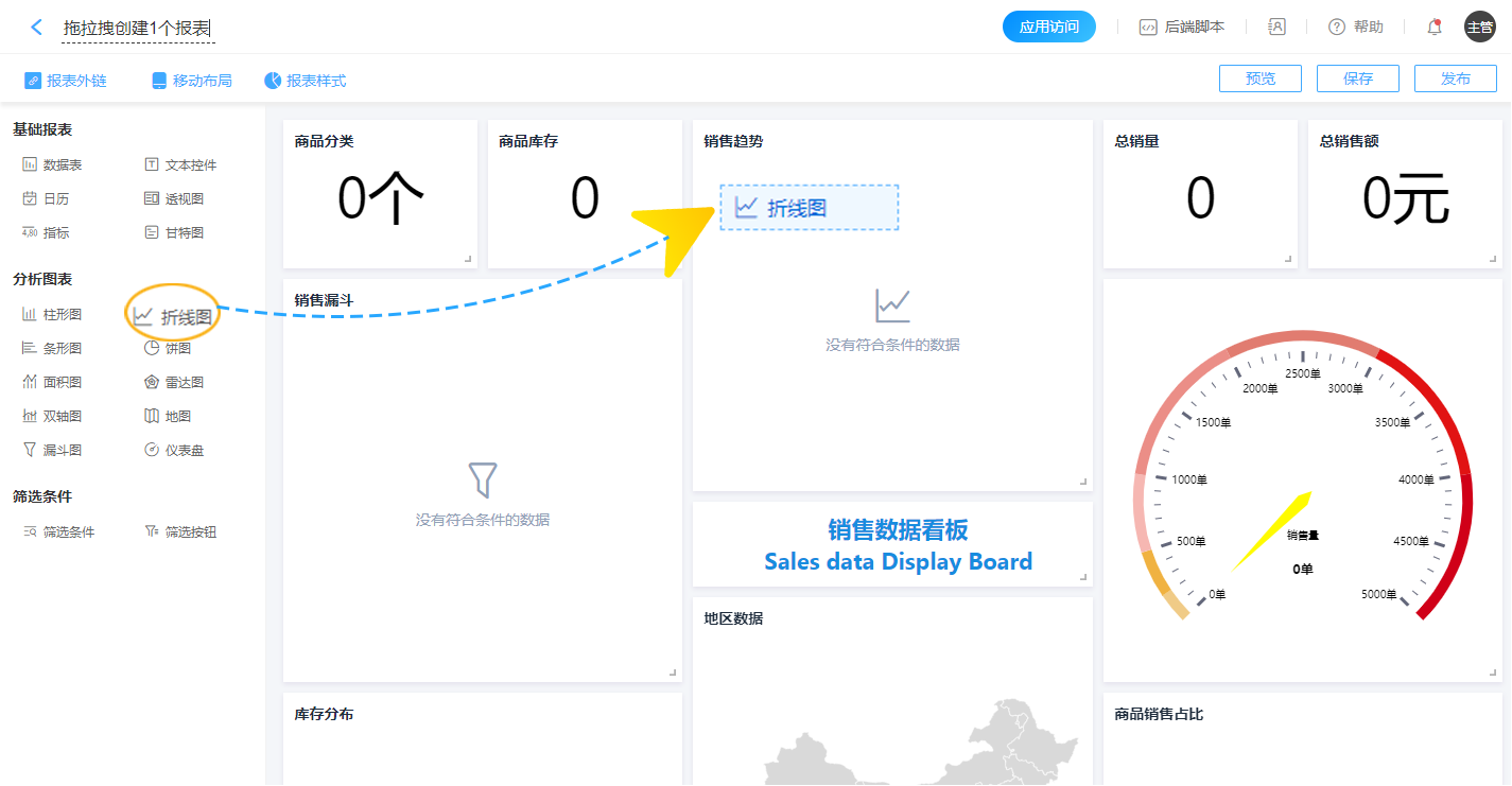 数转平台提供多样化图表、控件、表格等组件,不必预先导入数据,用户可以直接直接将所要呈现的组件拖拽到画布上进行自由配置和布局,通过简单的点击拖拽即可生成可视化页面,不写一行代码就能轻松编辑操作,让懂业务的人自己完成分析。