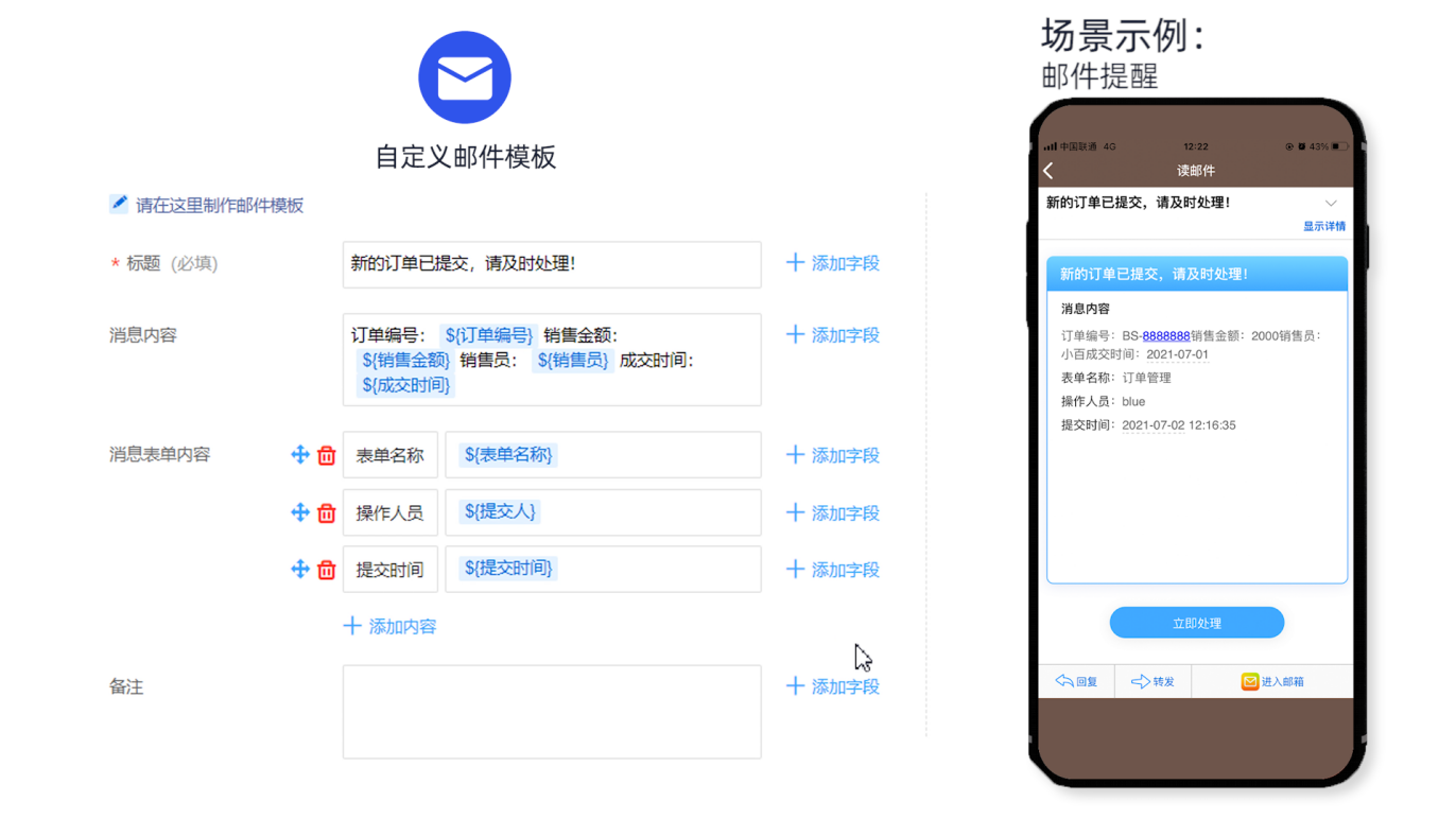而数转平台的「推送提醒」功能可以在满足提交条件之后,将需要提醒的数据,使用指定推送渠道发送给指定被提醒人相应的提醒信息,让消息提醒更准确、及时、直观地送达被提醒人并进行处理,使消息与业务直接挂钩。