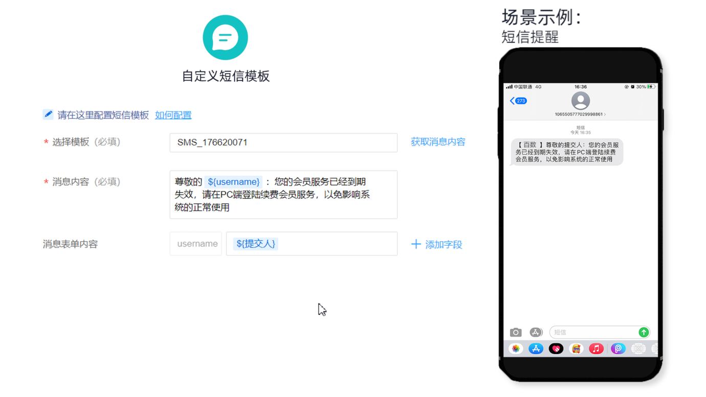 | 支持向指定手机发送短信,当表单有比较紧急的信息,可以选择使用“短信提醒”相关成员处理事务。