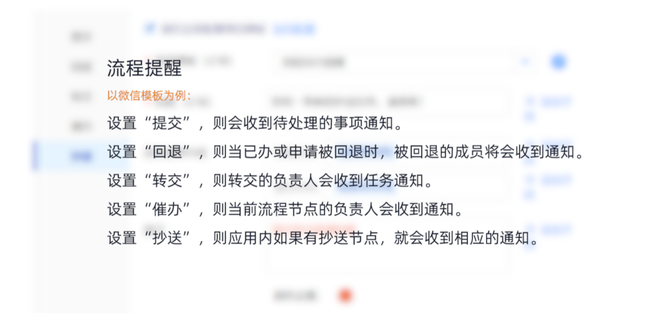 「推送提醒」提供七种消息推送渠道,可以设定以企业微信、微信、钉钉、飞书、短信、语音、邮件多种推送渠道提醒用户,并且不同的提醒方式可以自定义其消息模板,企业可以根据自己所属账号模式来设置对应的提醒样式及内容。 如:在使用流程催办功能时,配置好语音消息模板,这样就可以以语音的方式催办流程负责人,及时处理流程。
