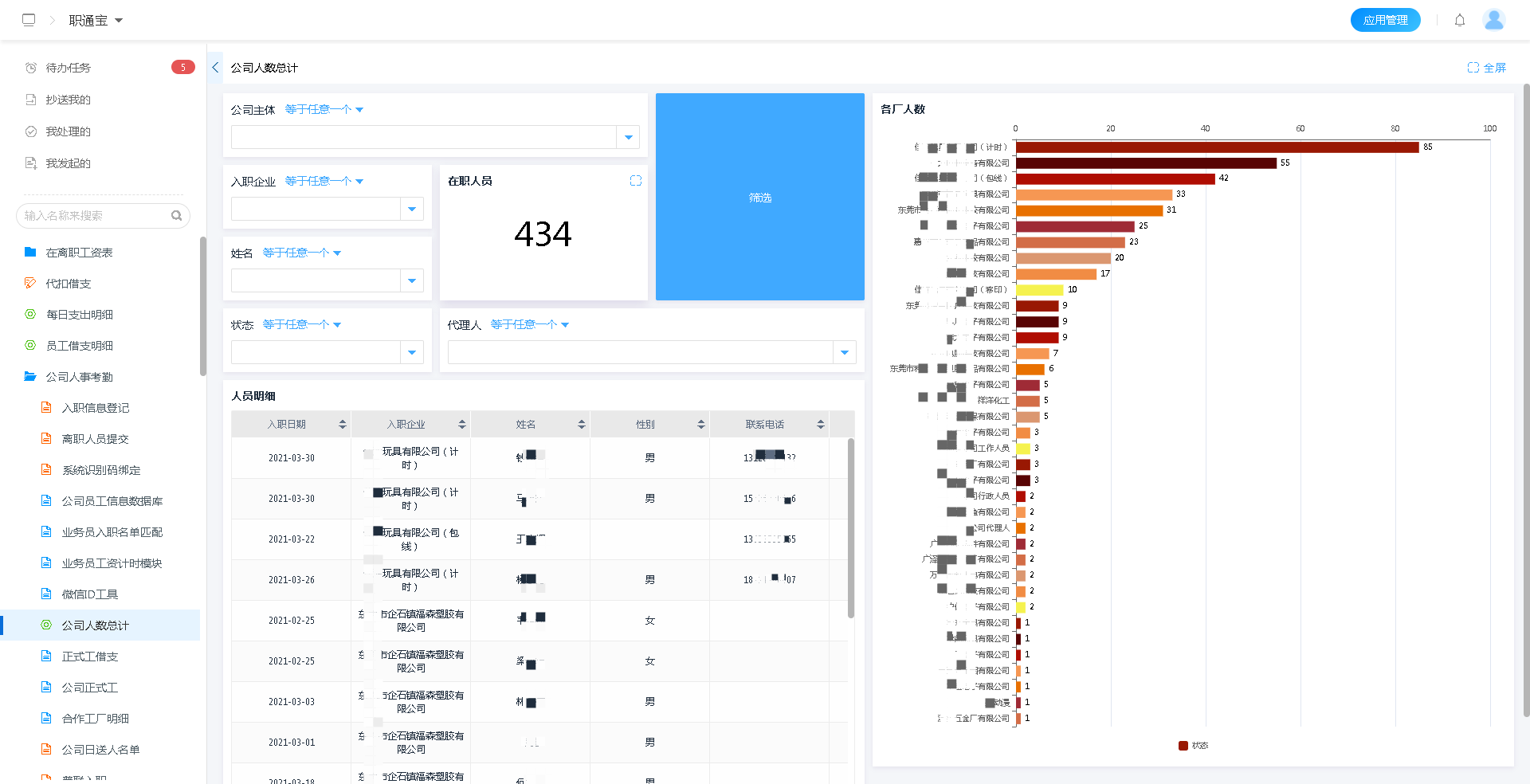 3、利用数转平台的报表体系,实时统计所辖企业的在职人员、离职人员、人员入职渠道以及各种与人事相关费用的申报、使用、管理情况。所有款项收支,无论是明细还是汇总分析,借助多样化报表展示一目了然。