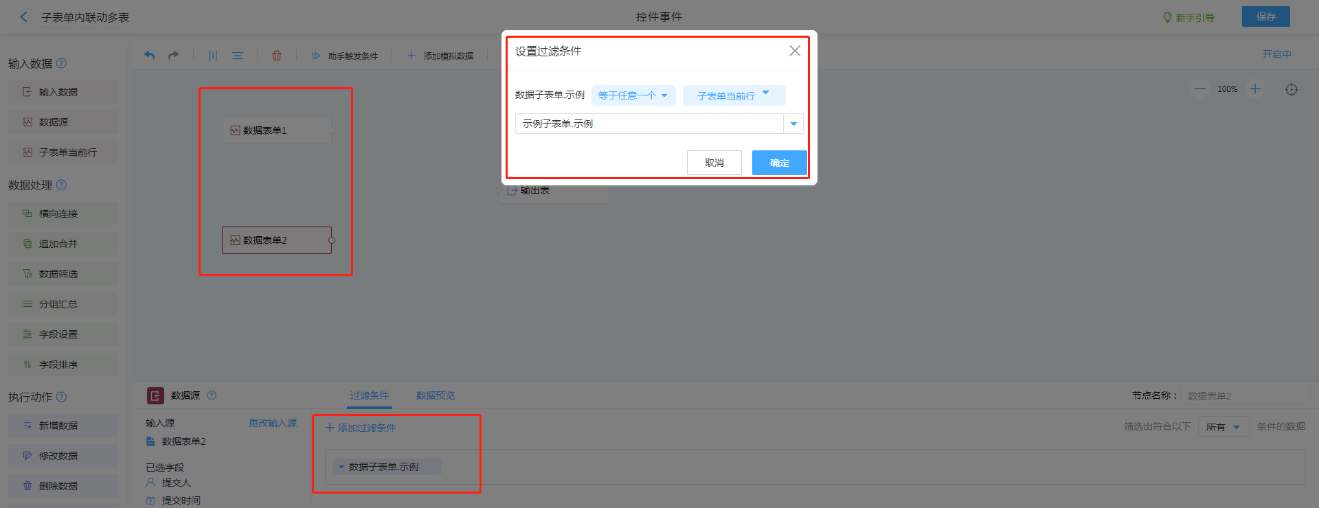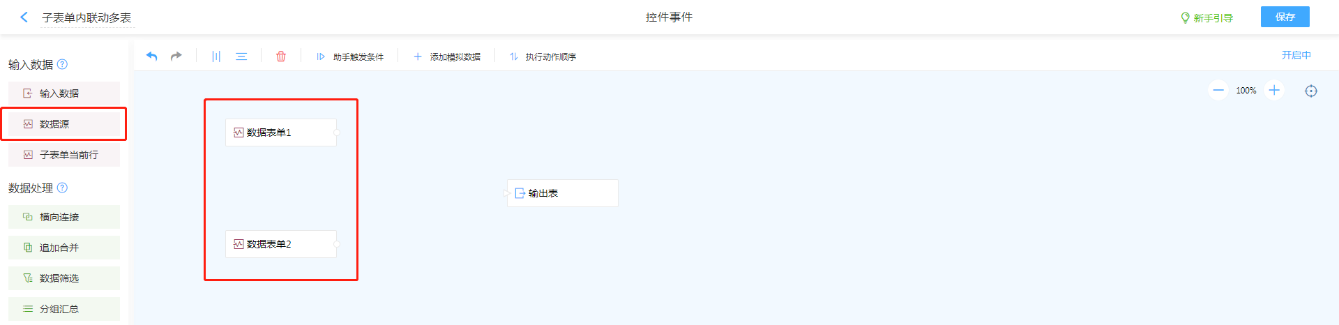 1. 输入数据选择数据源,找到需要关联的表单,如果需要多个子表单之中调取数据,则需要将所有子表单均进行操作,列出多个数据源。