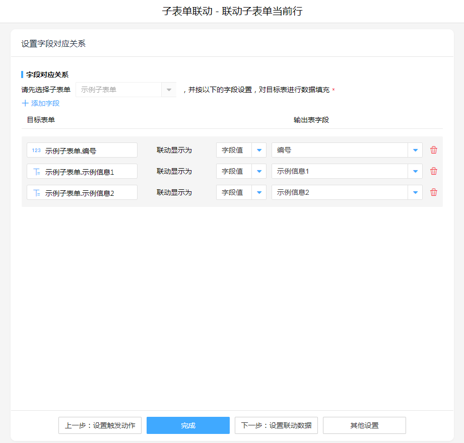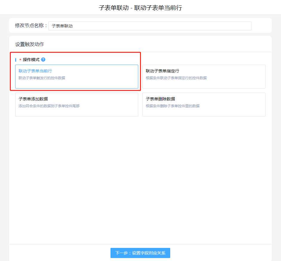 1. 添加执行动作子表单联动,操作模式选择"联动子表单当前行",设置联动对应关系。