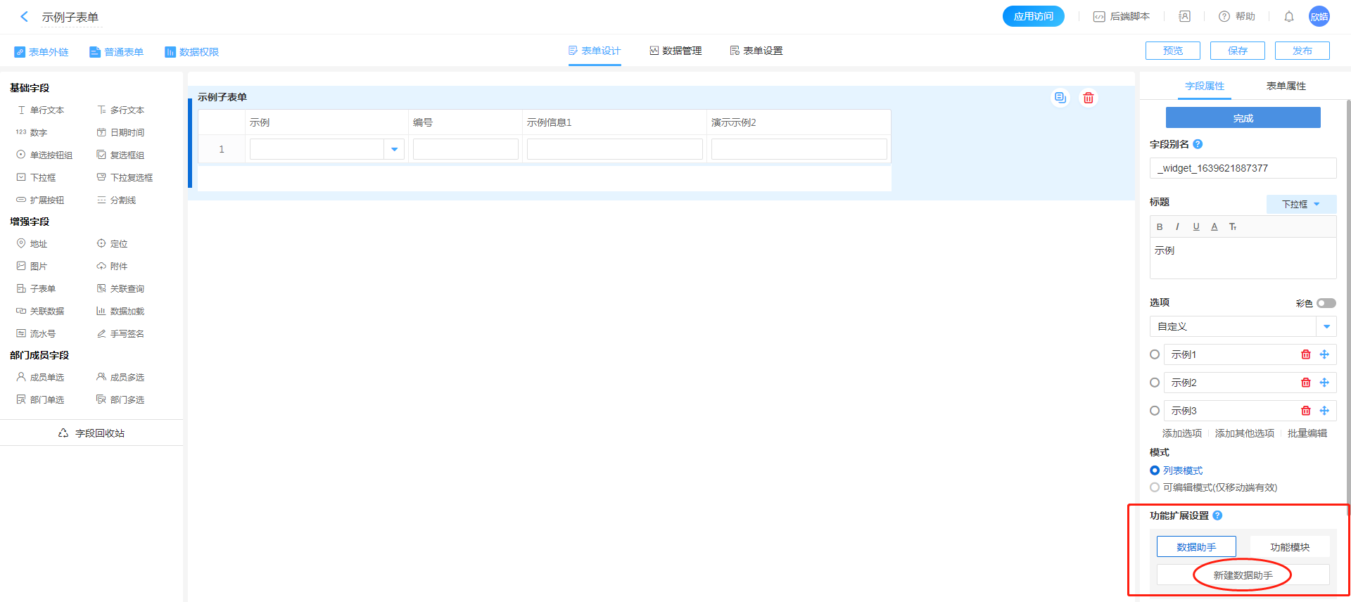 1. 进入表单配置页面,找到需要进行触发目标控件(本案例以子表单内下拉框控件为例),点击进入数据助手配置页面。
