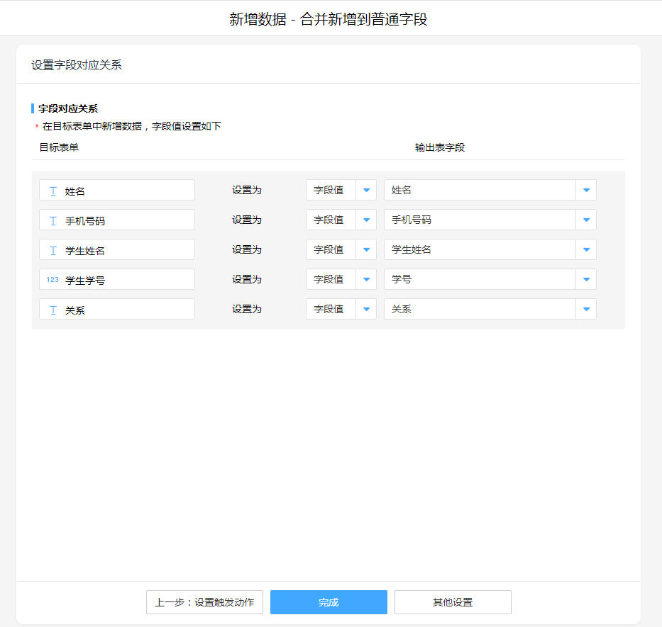 1. 添加执行动作子表单联动,选择目标表单,并按照数据格式进行操作模式选择,设置字段对应关系。