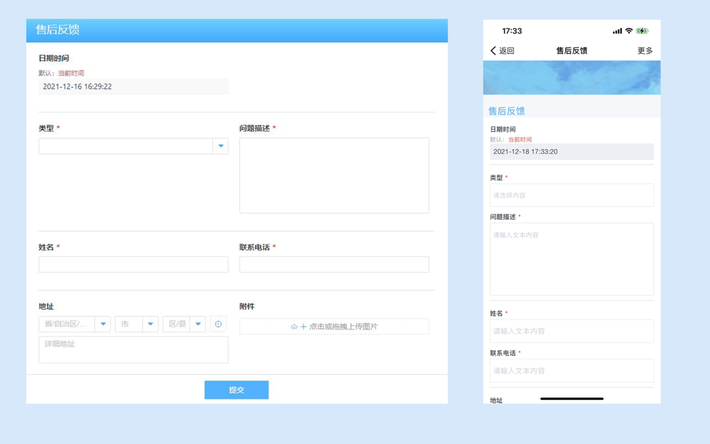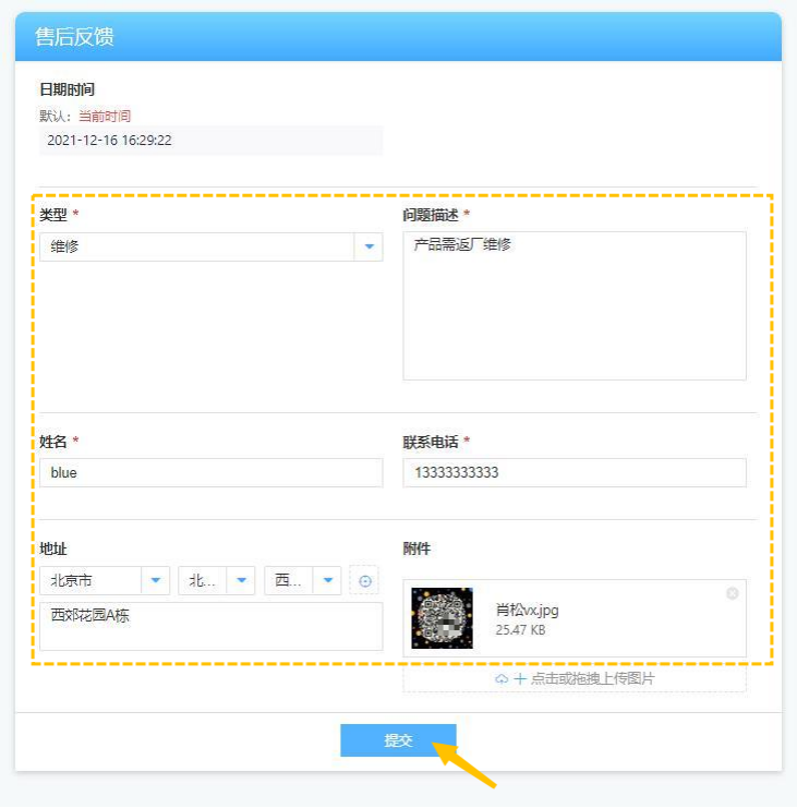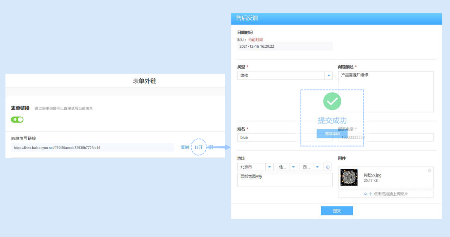 非团队成员通过访问链接即可直接填表提交,无需登录或加入团队。如将售后反馈表单分享给客户,客户即可直接填报反馈表: