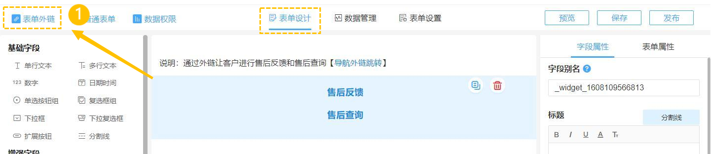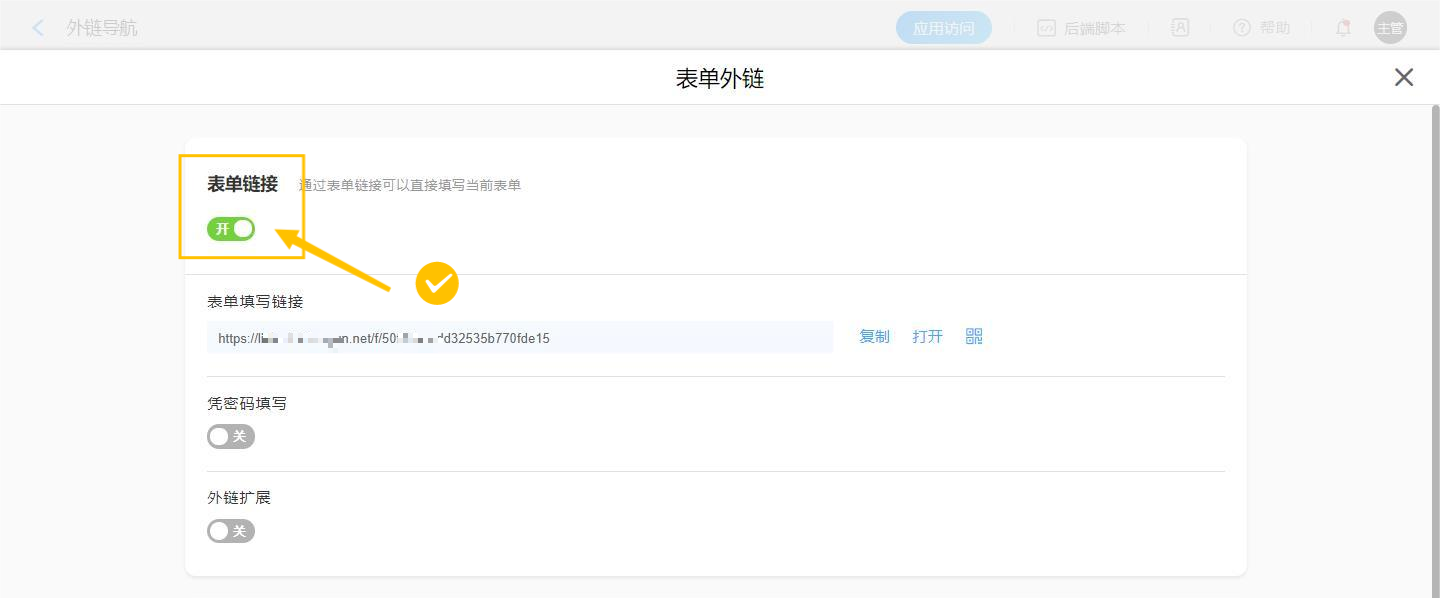 第①步. 在表单编辑页面>>表单外链>>开启“表单链接”开关,即可开启当前表单的外链功能。