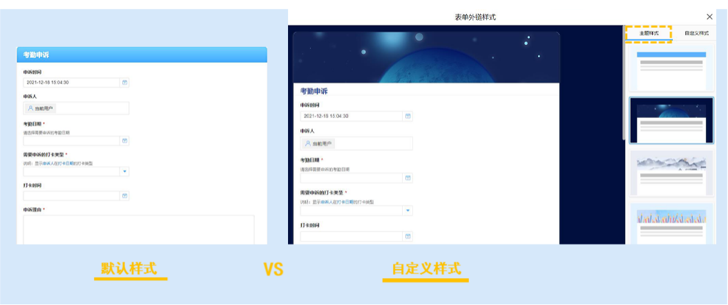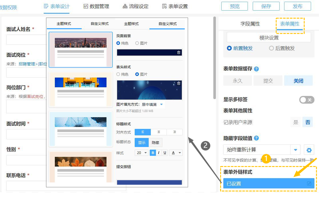 每个企业都有自己的品牌标识,通过表单设计>>表单属性>>表单外链样式的个性化设置,可以从第一视觉观感上树立品牌形象。数转平台不仅提供了20多套主题样式可供选择使用,也可以由你自定义外链样式,借助视觉效果来更好的提升品牌辨识度。