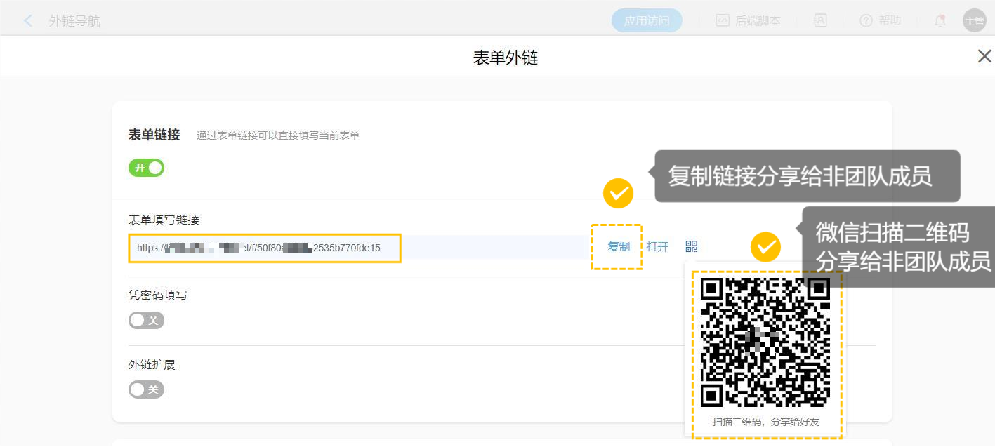 第②步. 开启外链功能后,可以将表单链接发送给非团队成员,同时也可以生成二维码,通过微信扫码直接打开表单。
