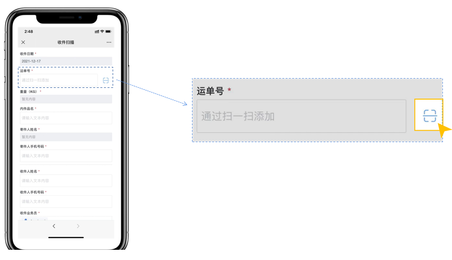 在数转平台移动端后台找到物流派件跟踪系统,进入扫描表单中就能看到运单号的右侧有扫描提示。