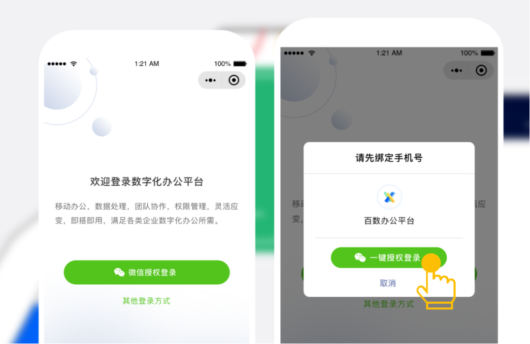 数转平台全面支撑微信账号一体化,数转平台账号均可“一号登录”微信体系,即只需一个账号,一次登录,即可在微信小程序与公众号同步使用,构建一体化的便捷体验。