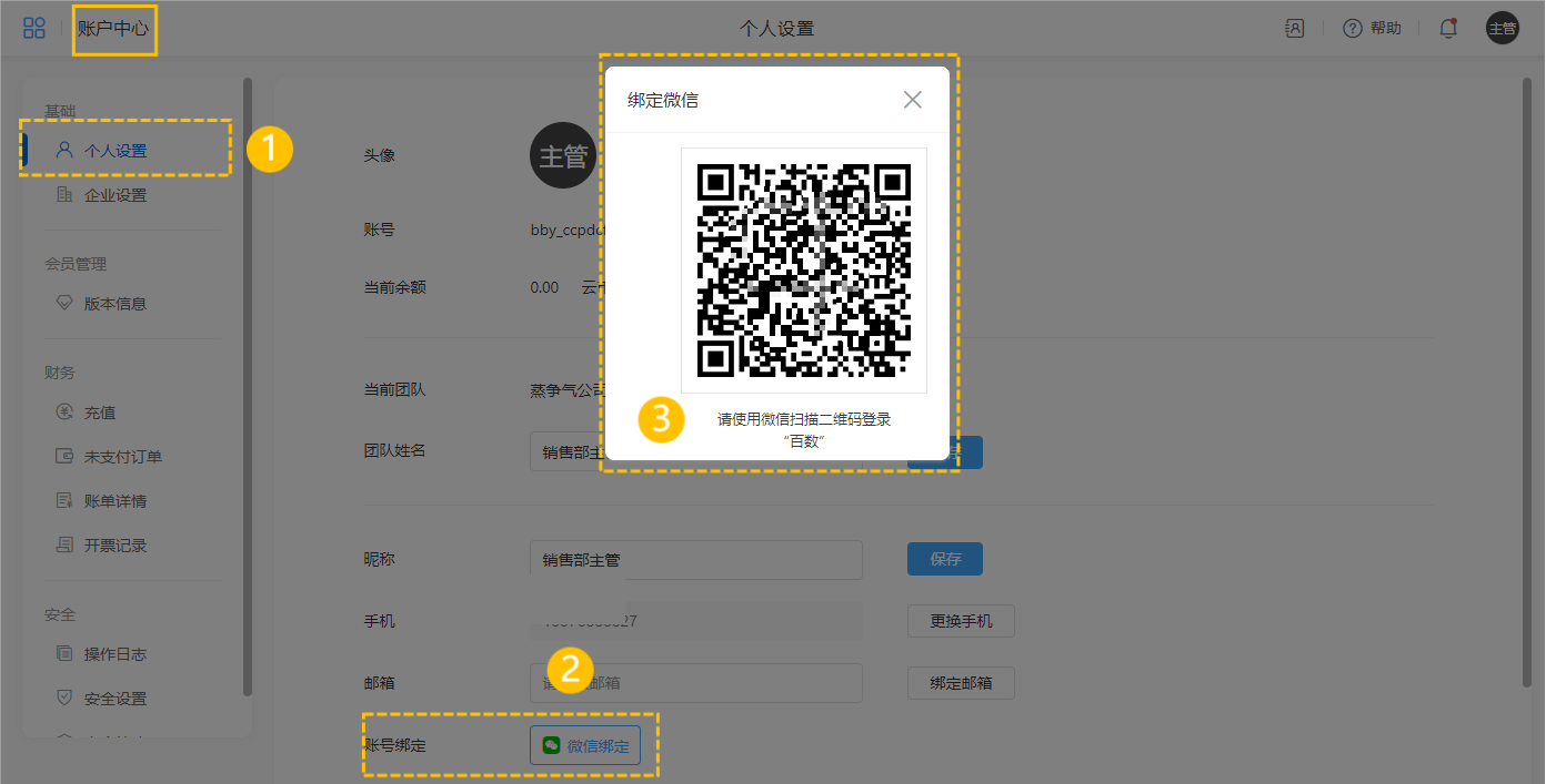 1.在数转平台个人中心将数转平台账号扫码绑定微信