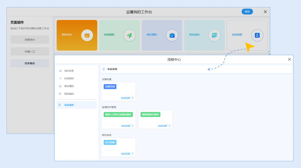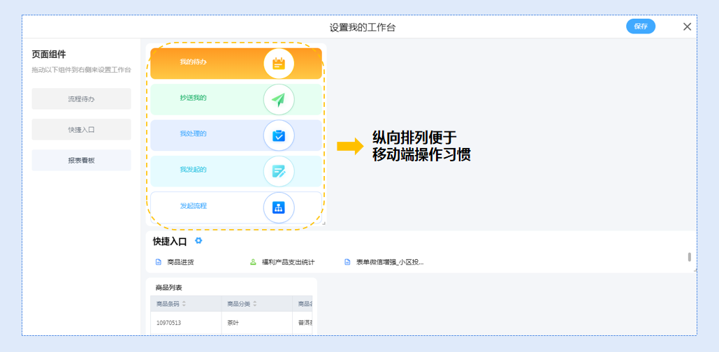 而个人工作台,员工可以按照自己的工作习惯进行自定义设置,设置操作也十分简单,点击拖拽即可完成。