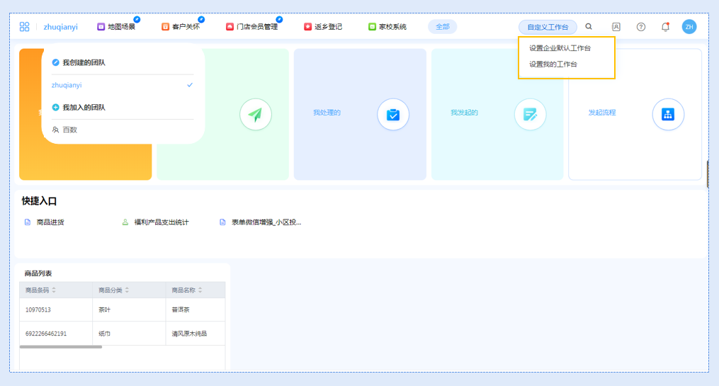 系统管理员可以设置企业默认工作台,当团队成员未设置自己的工作台时,默认使用企业工作台;