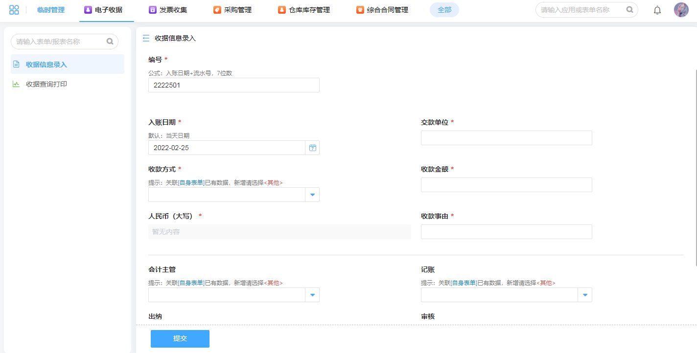 根据收据信息日常所需的信息类目制定收据信息录入表,根据控件提示就可以方便快捷的录入相关信息,减少录入纰漏。