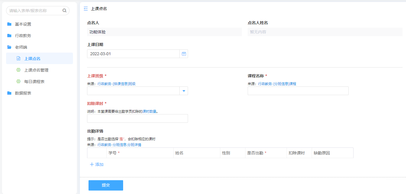 对于缺勤或请假的学员,在上课点名表单,任课老师可以快速进行登记。