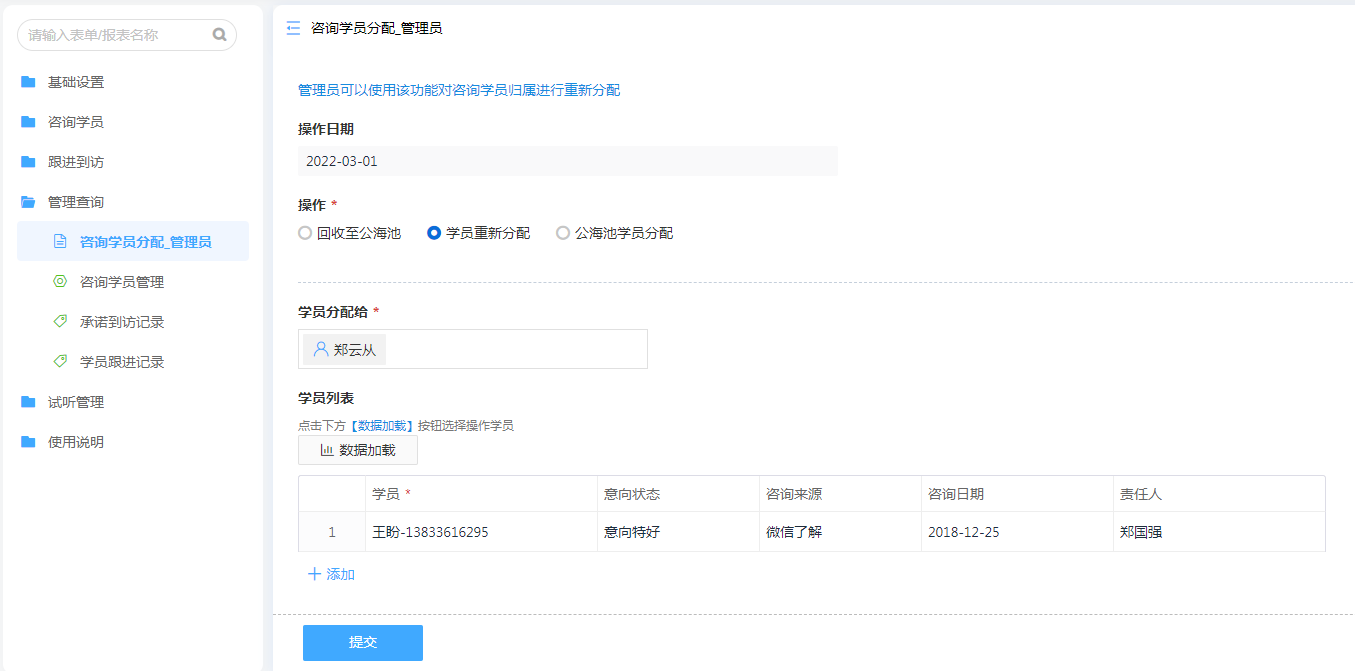 为了方便招生部门统一管理,管理员可以对咨询学员进行再分配,可以选择制定分配到人或者重新挪到公海池便于其他老师选择跟进。