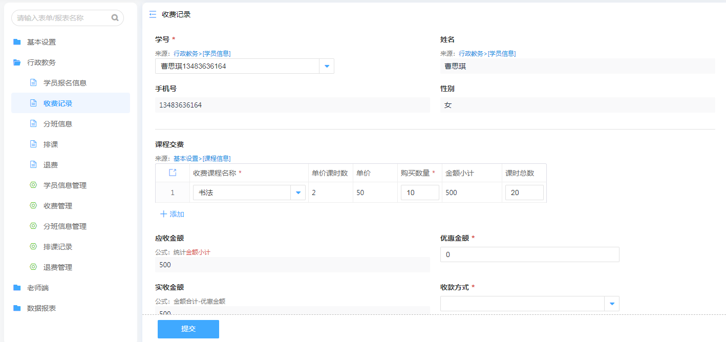 课程收费环节通过在线表单可以直接绑定学员信息和课程信息,下拉直接选择学员以及课程名称,修改课程数量,系统能够自动完成费用计算。