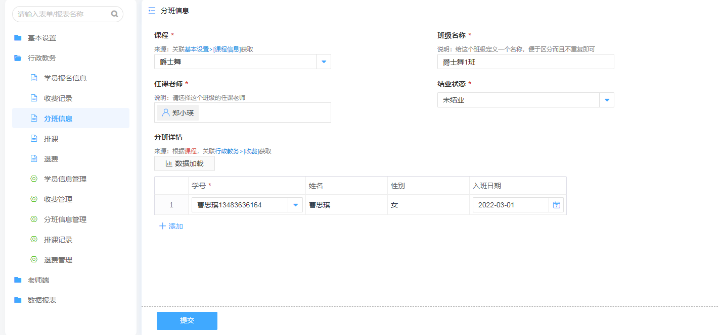 分班详情我们通过数据加载功能,可以对接到收费表单,在已经缴费的学员列表中勾选分班。