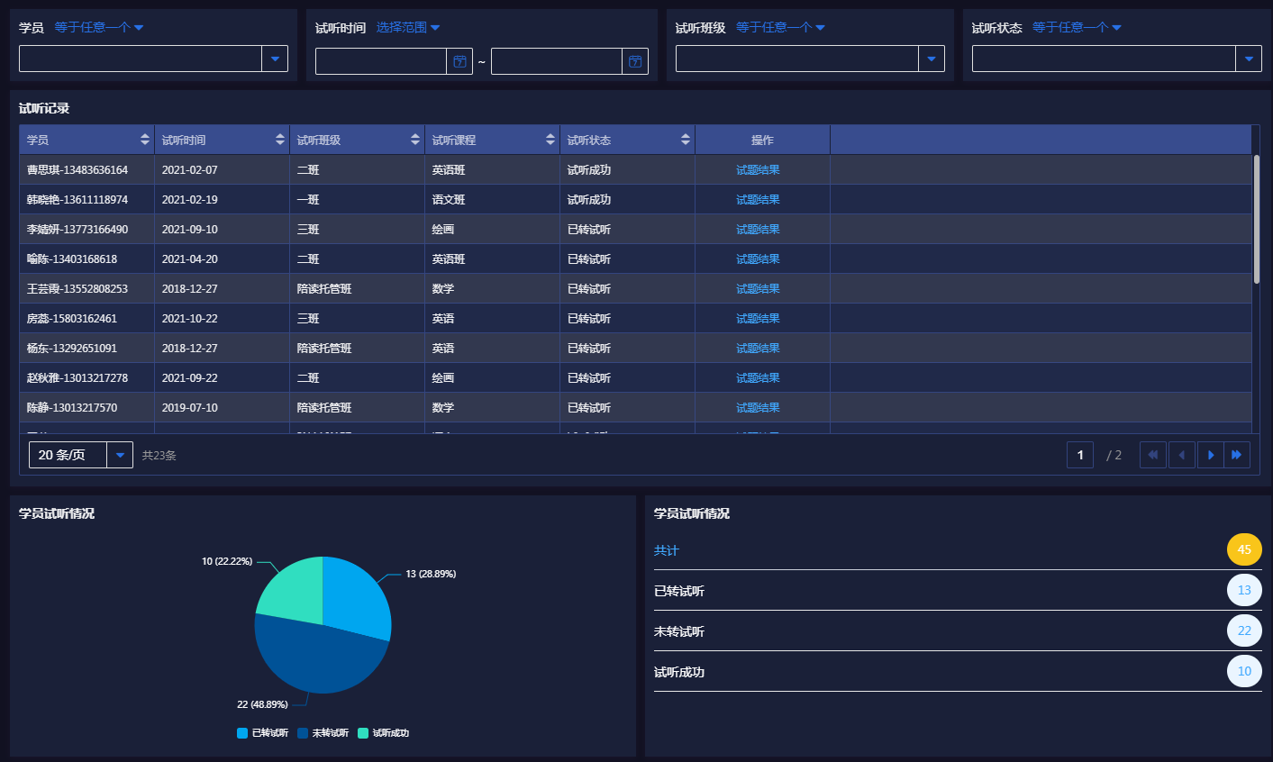 借助数据视图报表,除了可以借助列表展示试听记录外,还可以设置饼状图、指标图等反映学员试听的数据情况。