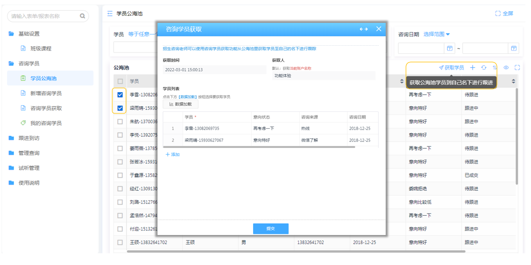 新增的咨询学员默认汇总到公海池报表中,招生咨询老师可以使用咨询学员获取功能从公海池里获取学员至自己的名下进行跟踪。