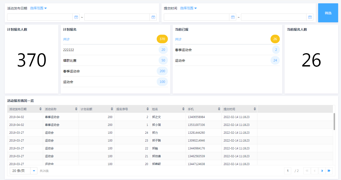 学校组织活动的报名情况借助丰富的图表展示,一目了然,便于学校老师把控报名情况,应对活动的宣传开展。