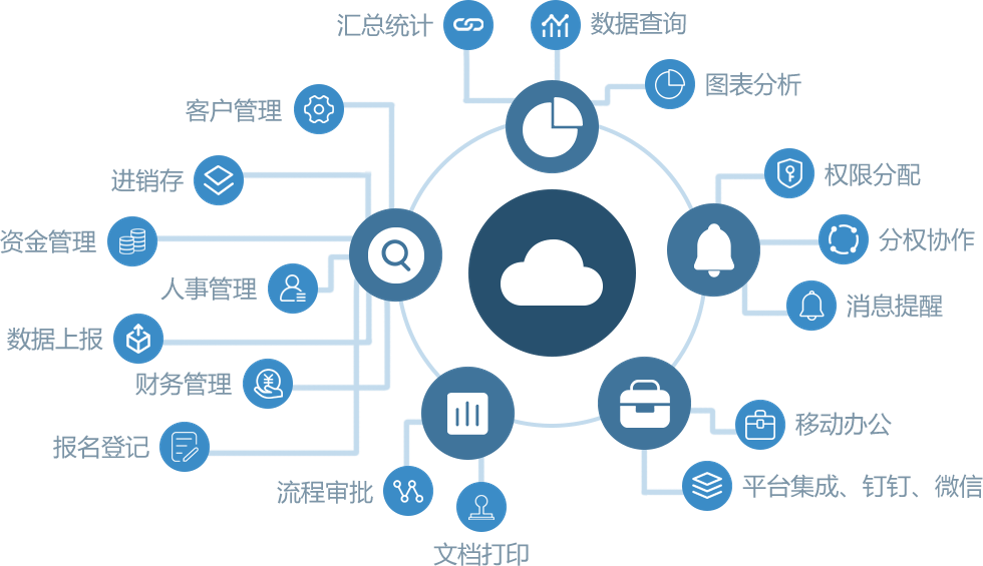 数转平台的系统架构为了保证后期的可扩展性,在安全体系和权限体系可控的保证下,对各主流平台都提供了对接能力。选择数转平台私有化部署,平台强大的功能体系能够帮助你实现全业务流程数字化运转,无需跳转多个协作办公平台,在数转平台就能实现一站式办公。