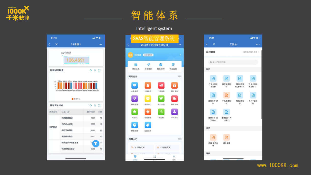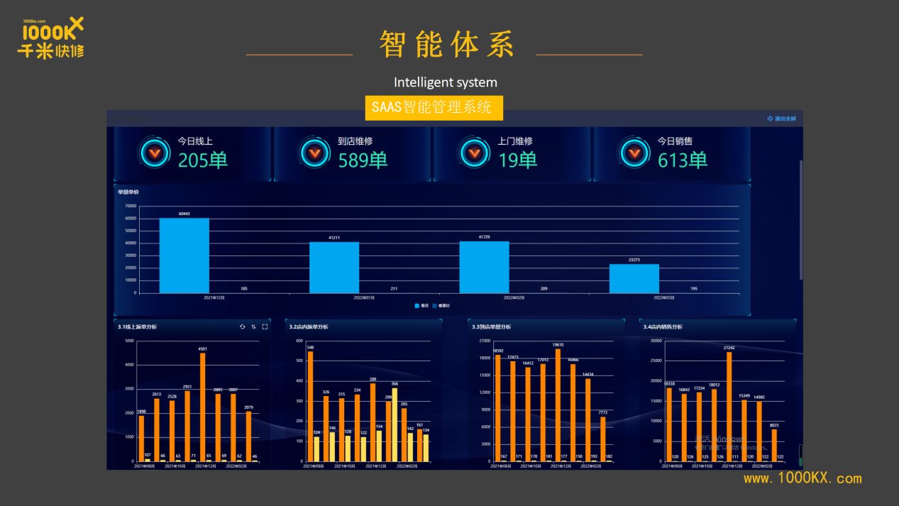 千米快修选择数转平台搭建SaaS智能管理系统,从人、钱、事、物四个维度进行应用开发配置,实现包括门店员、财务、销售、库存等多板块智能管控。