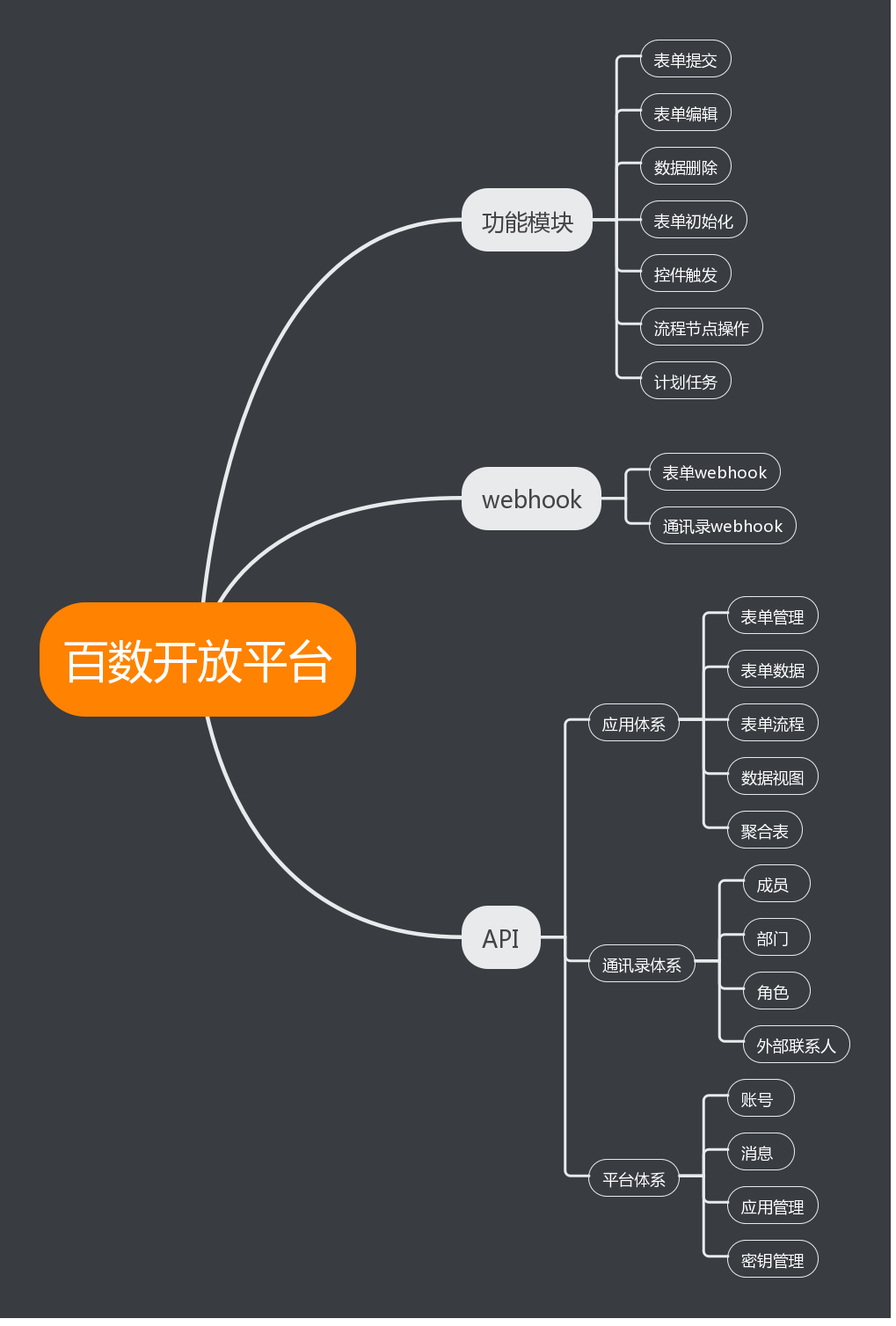 数转平台开放平台是基于产品内的 API接口,为用户提供开发能力,让用户可以通过自主开发或者使用官方、第三方服务商等开发的功能来实现企业系统之间互通的需求。除开webAPI接口,数转平台开放平台还包括:表单 webhook、通讯录 wehook、功能插件、密钥管理等功能。