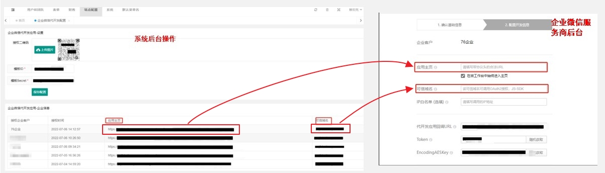 客户系统中提交代开发应用授权后,在 [系统后台] - [站点信息] - [第三方配置] - [企业微信代开发配置] - [企业微信代开发应用-企业信息] 下,会显示该客户的企业信息,[ 应用主页] 和 [可信域名]自动生成。