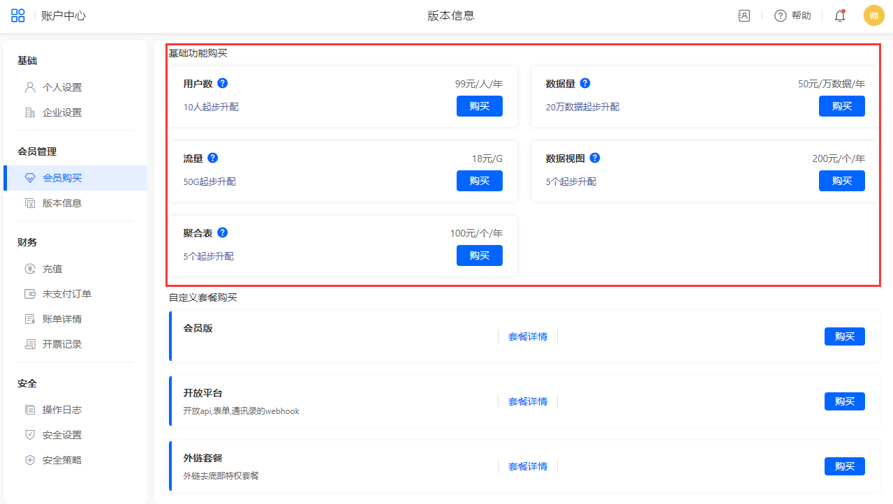 购买设置页面,主要是对会员购买基础套餐进行开关设置。