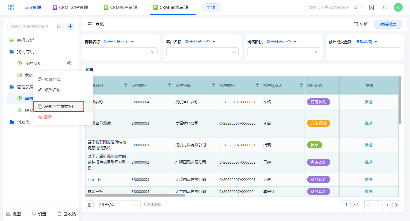 1)该报表为管理员查看,复制【我的商机】报表,名称改为【商机】;