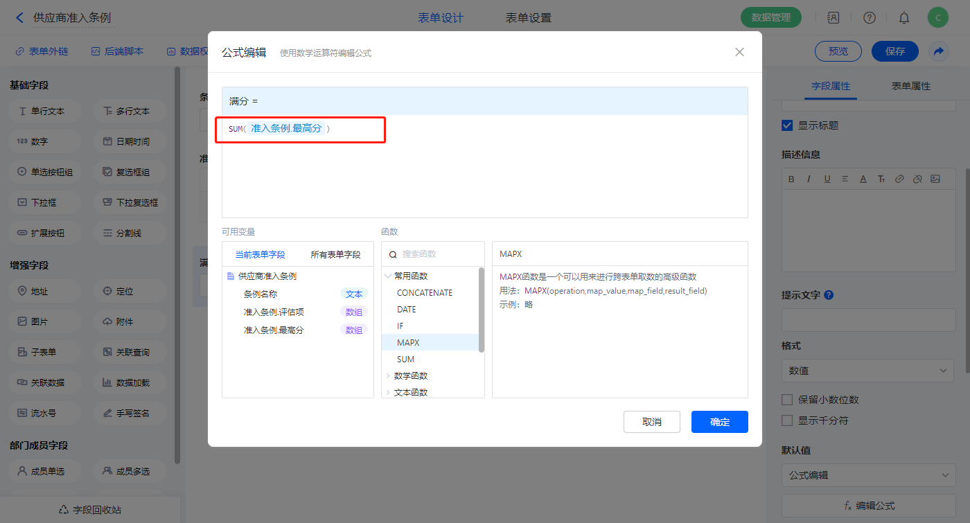 4)【满分】字段,设置默认值为数据联动,设置联动条件及联动字段;