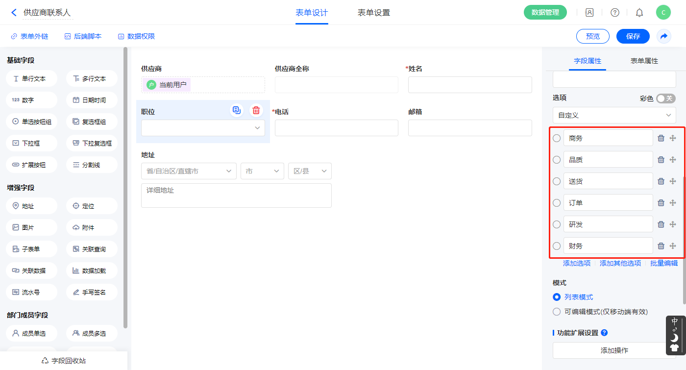 2.5、表单【供应商联系人】字段及表单属性设置