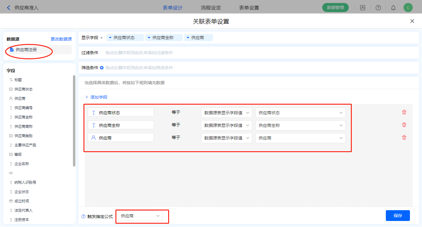 1)选择【选择待准入的供应商】数据加载字段,设置数据源为【供应商注册】,添加显示字段及赋值字段,触发公式为【供应商】字段;