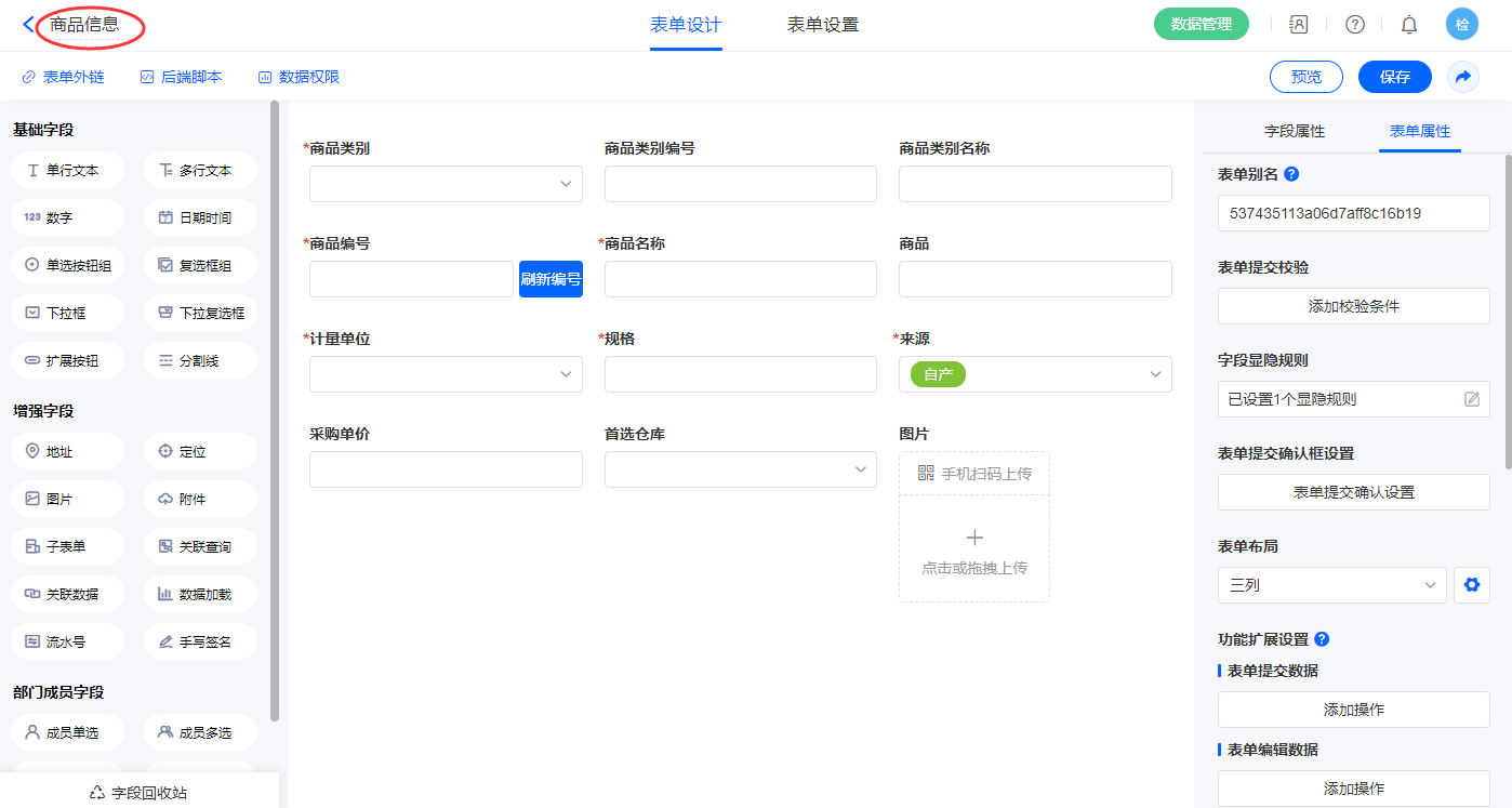 2.2、表单【商品信息】字段及表单属性设置