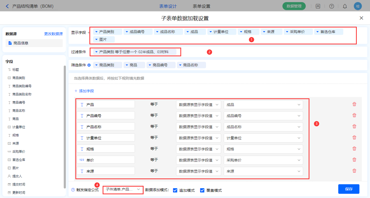 3)【子件清单】子表单字段,开启数据加载,数据源为【商品信息】,添加显示字段设置赋值字段及过滤条件,触发公式为【子件清单.产品编号】字段,点击保存;