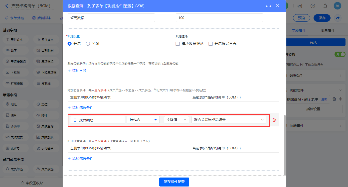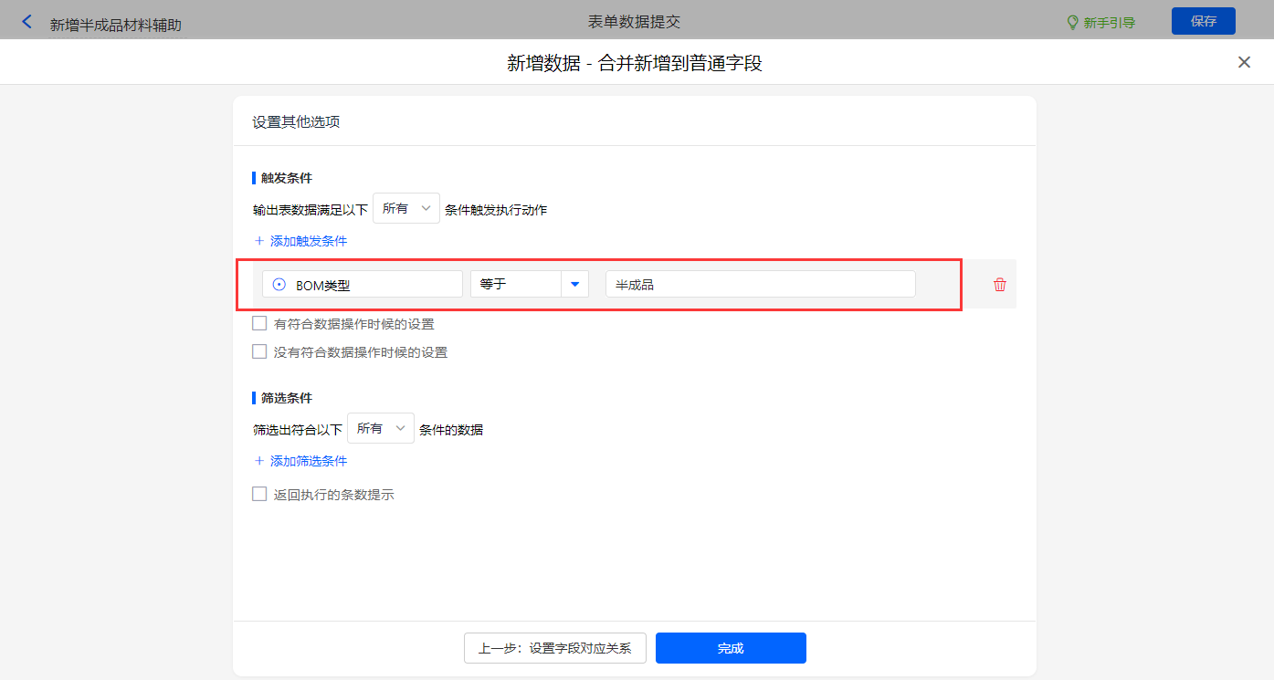 其他设置触发条件为【BOM类型】字段等于半成品,设置好点击【完成】并保存该数据助手;