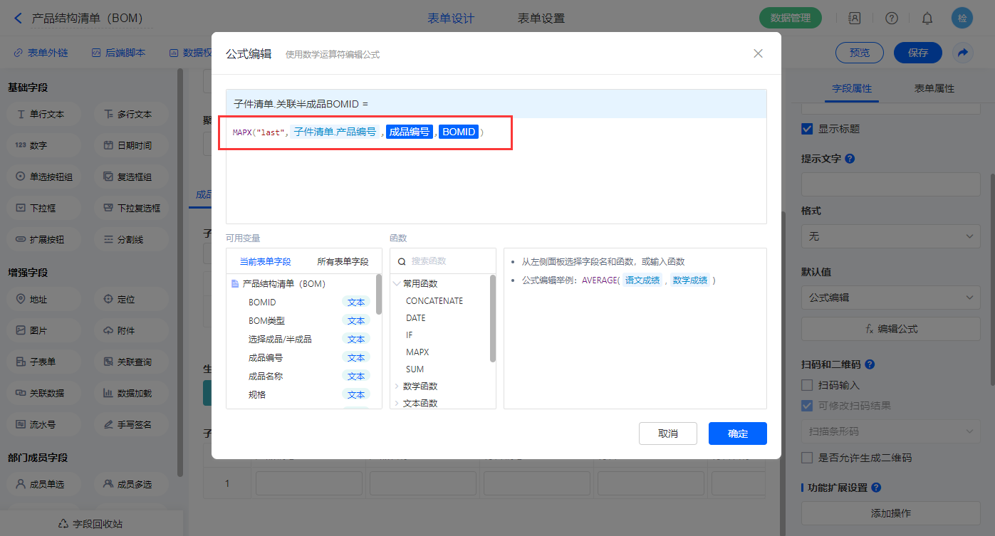 【子件清单.关联半成品BOMID】字段,设置默认值为公式编辑,如图设置公式;