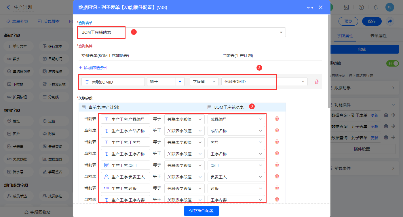 设置三个【数据查询 - 到子表单】功能插件,如图配置;第一个配置【子生产计划明细】子表单;
