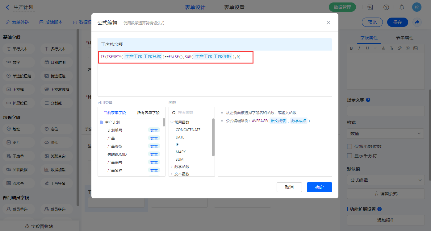 【总工序内容】字段,设置默认值为公式编辑,如图设置公式;