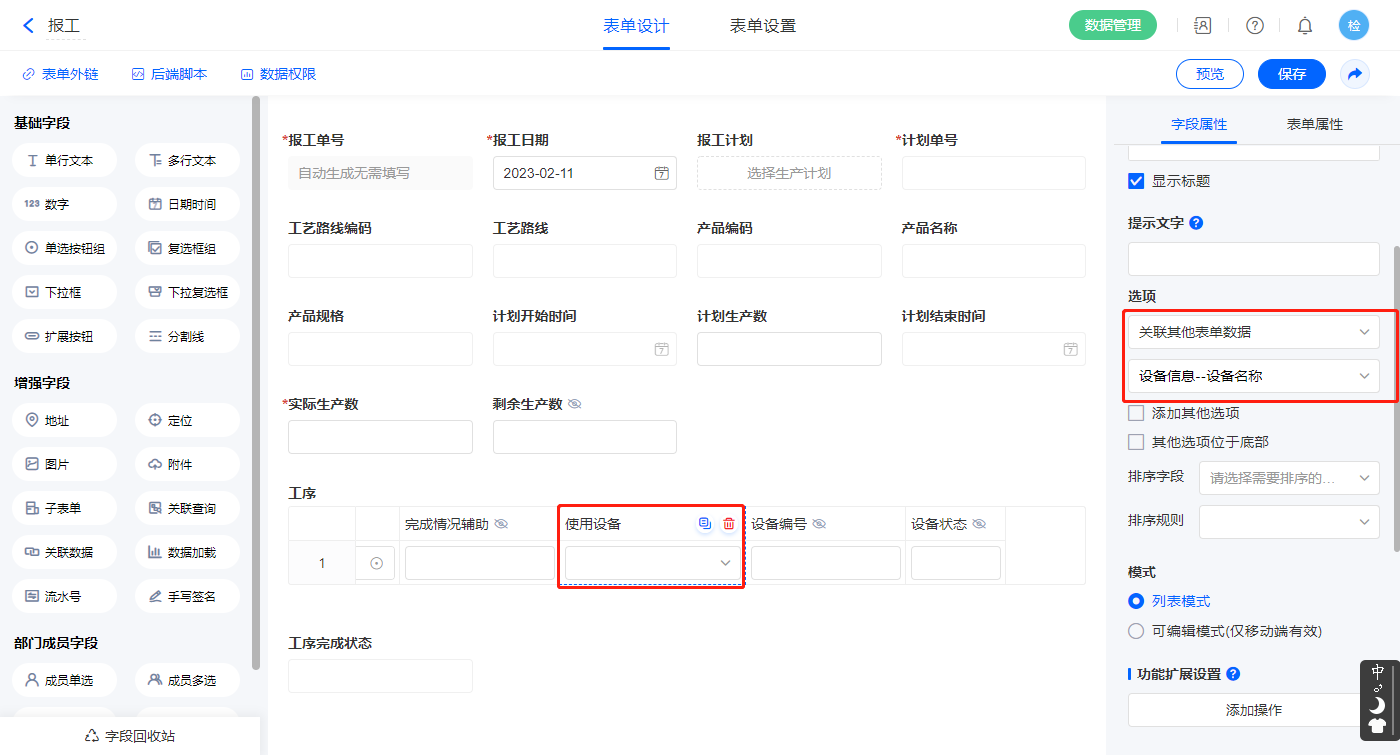 【工序.使用设备】字段,选择设置为关联其他表单数据,关联设备信息的【设备名称】字段;